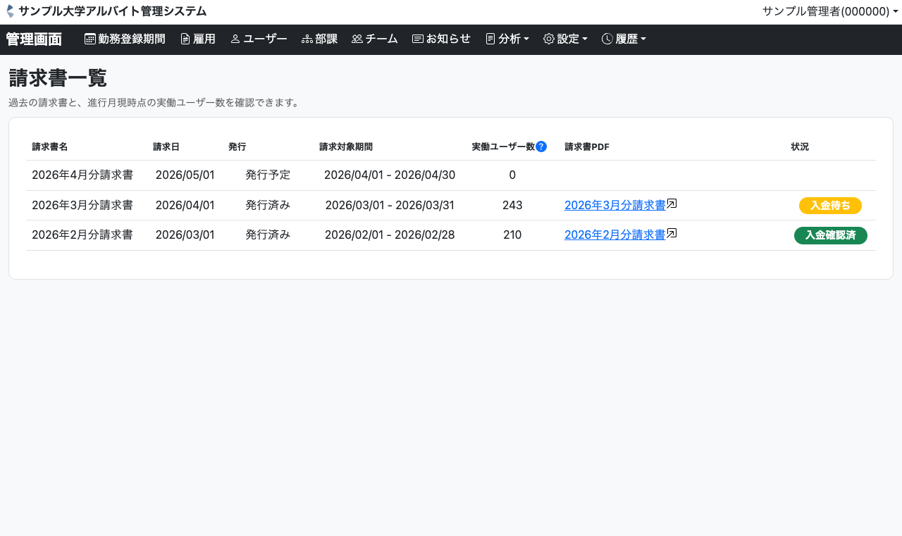 過去及び進行月の実働ユーザー数や、発行された請求書PDFが確認できる画面です。毎月の費用予測や、請求処理時の添付資料として活用いただけます。