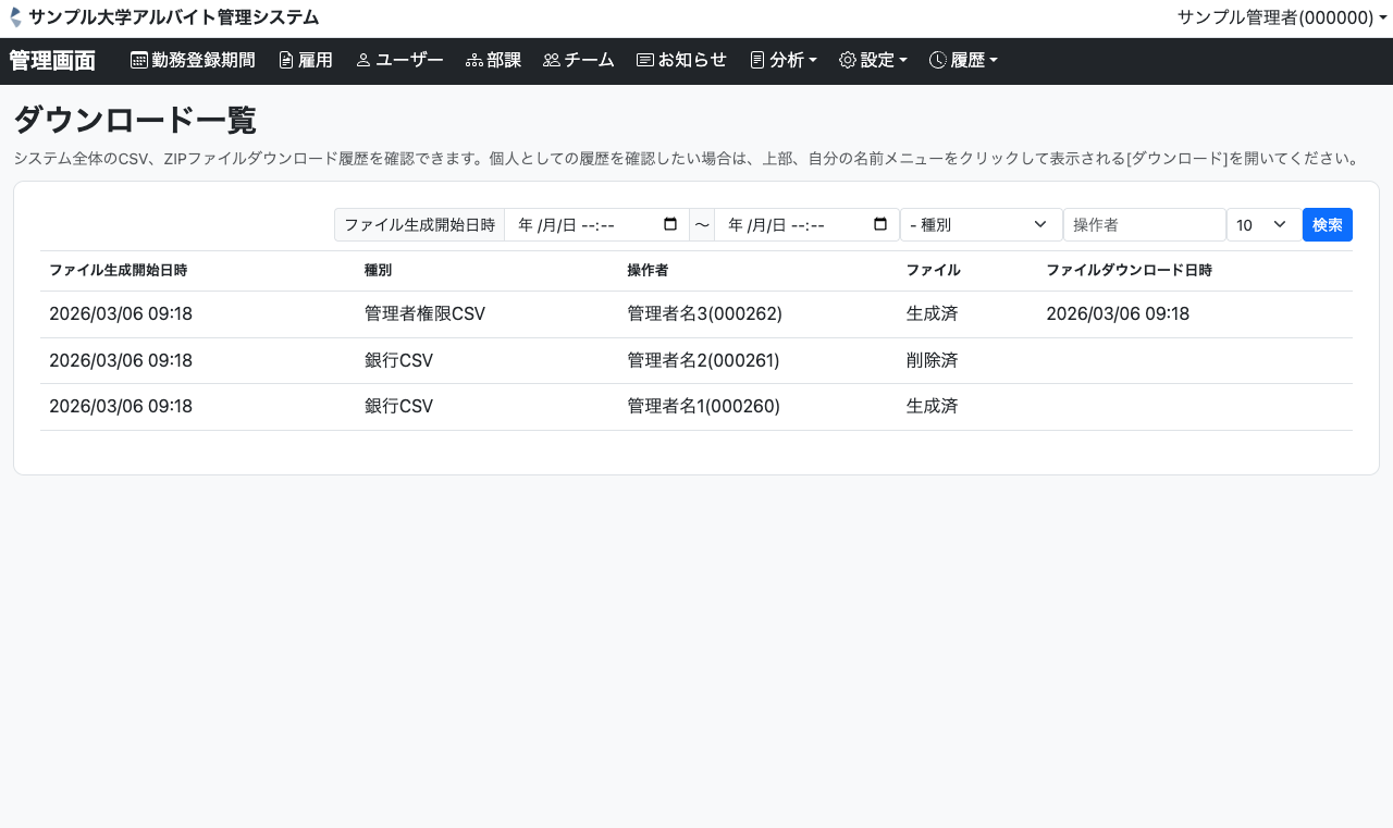 システム内で行われたダウンロードを確認できる画面です。誰がいつどのようなファイルをダウンロードしたかがわかるため、監査やトラブル対応に活用いただけます。