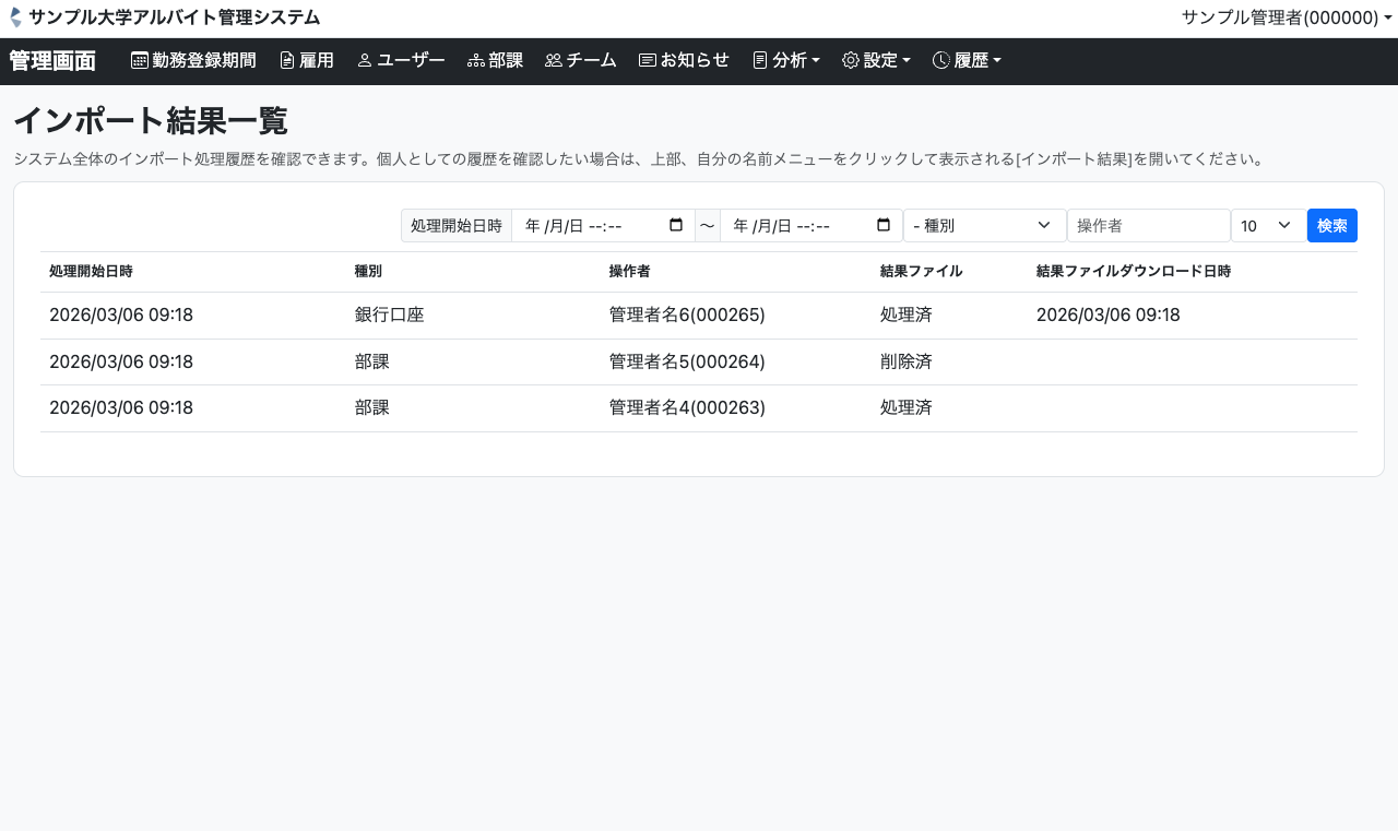 システム内で行われたインポート結果を確認できる画面です。誰がいつどのようなデータをインポートしたかがわかるため、監査やトラブル対応に活用いただけます。