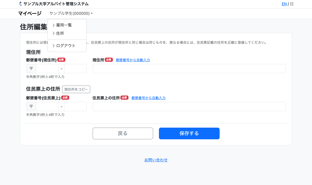 登録後は、上部の自分の名前をクリックして開くメニュー内の[住所]から同画面に移動し内容の確認をすることができます。勤怠設定で「登録後変更可」になっている場合、利用者の任意のタイミングでこちらの画面で変更を行うことができますが、「登録後変更不可」になっている場合は初期(または未設定時)登録後は、編集ロックがかかり変更ができなくなります。