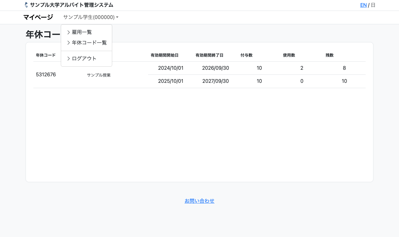 利用者に関連して設定されている年休コードやその付与数、使用数、残数の一覧を確認することができます。上部の自分の名前をクリックして開くメニュー内の[年休コード一覧]から移動することができます。