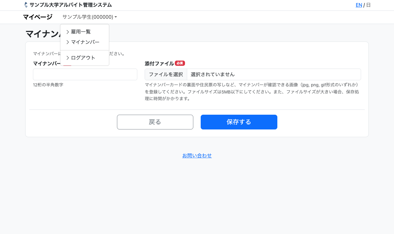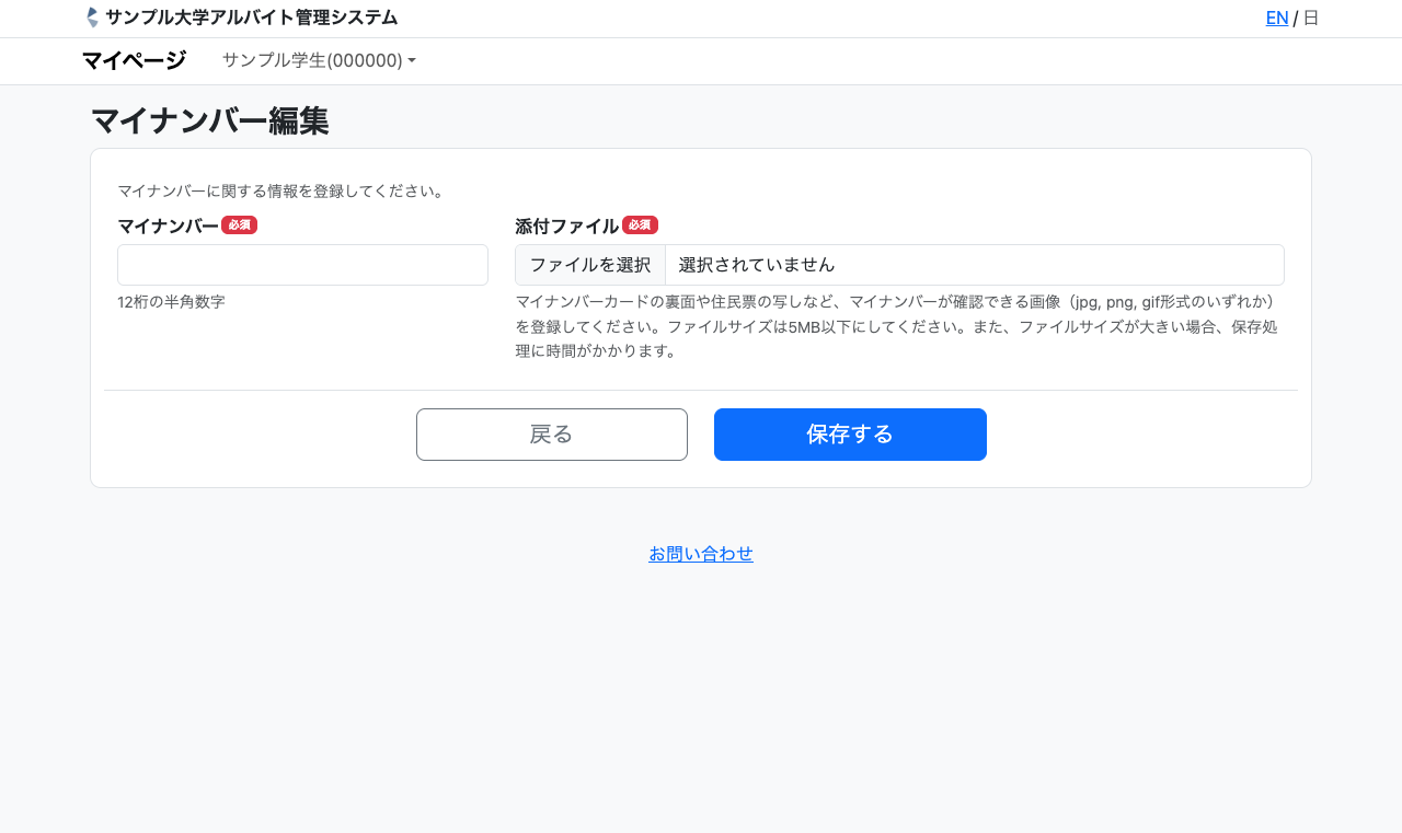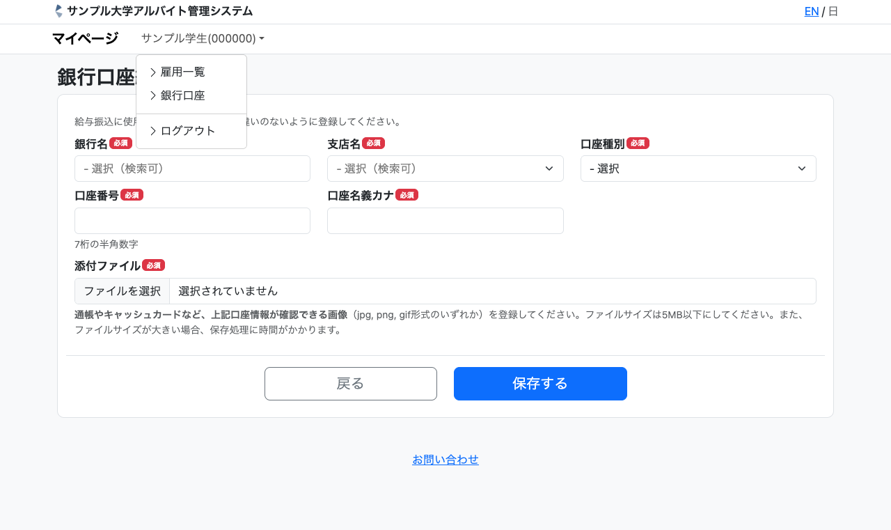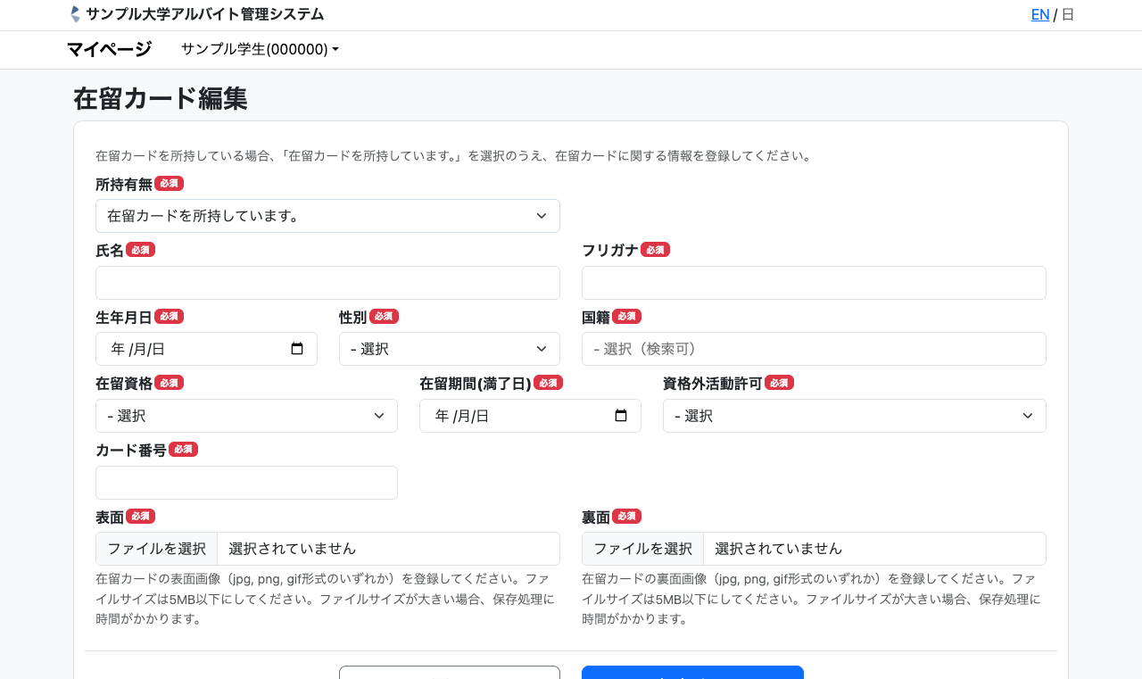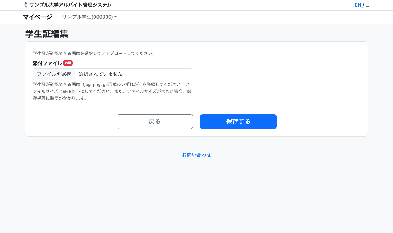 勤怠設定で学生証情報を「取得する」になっている場合に、利用者はシステム利用時に未登録であれば自動的にこの画面に転送され登録を求められます。学生証の画像登録を求めるようになっており、登録された情報は管理画面側でダウンロードできるようになっています。各種申告に必要な情報をKinmuuを通じて集めたい場合に便利です。