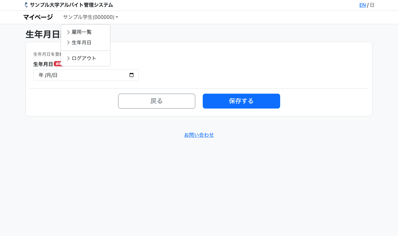 登録後は、上部の自分の名前をクリックして開くメニュー内の[生年月日]から同画面に移動し内容の確認をすることができます。勤怠設定で「登録後変更可」になっている場合、利用者の任意のタイミングでこちらの画面で変更を行うことができますが、「登録後変更不可」になっている場合は初期(または未設定時)登録後は、編集ロックがかかり変更ができなくなります。