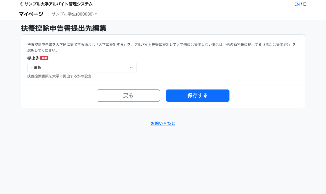 勤怠設定で扶養控除申告書提出先情報を「取得する」になっている場合、利用者はシステム利用時に未登録であれば自動的にこの画面に転送され登録を求められます。大学に提出するのか、それ以外に提出するかの回答を求めるようになっており、登録された情報は管理画面側でダウンロードできるようになっている他、給与支払い用の勤務集計CSVファイルに、回答内容を表示する列が差し込まれるようになります。甲乙判定に必要な情報をKinmuuを通じて集めたい場合に便利です。