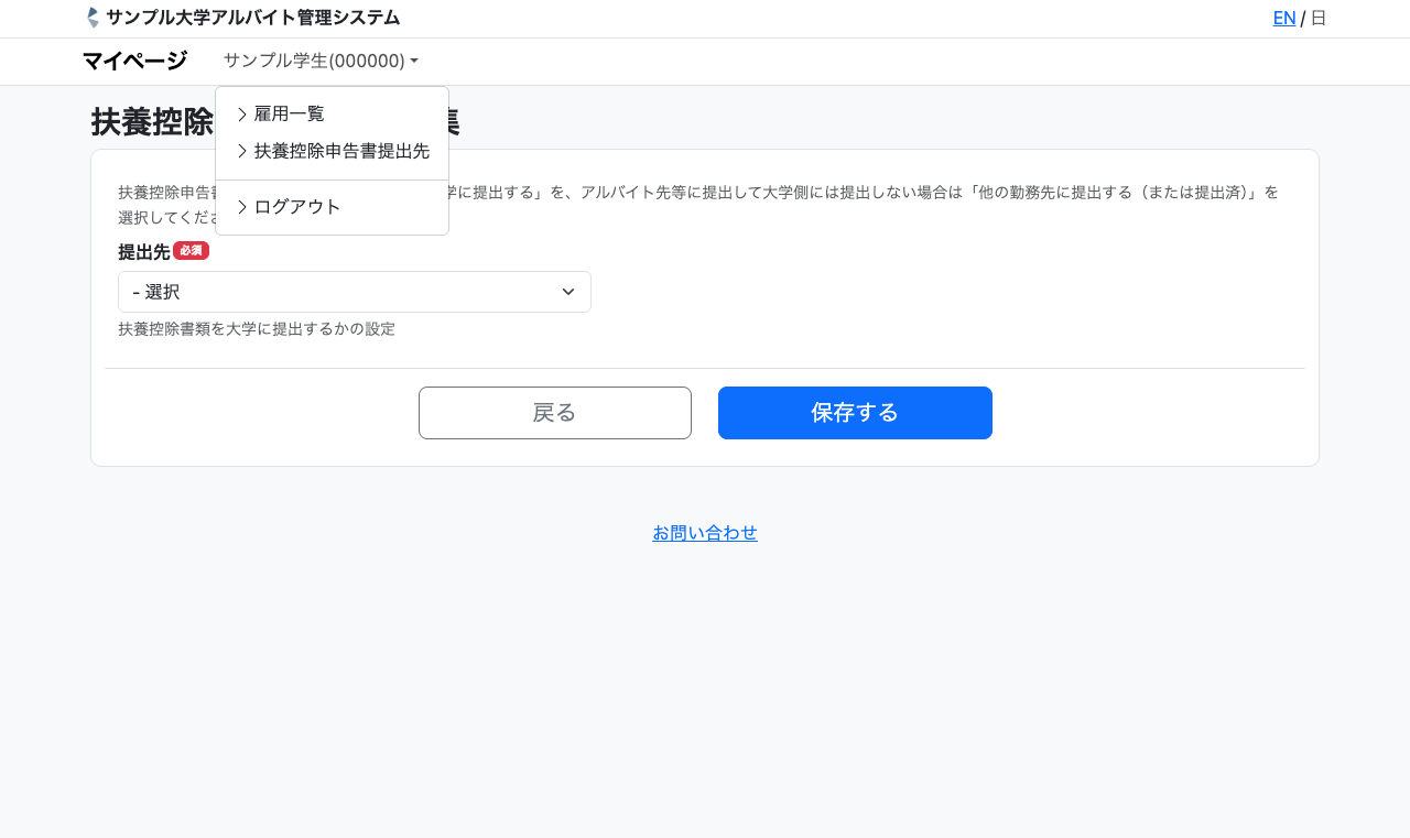登録後は、上部の自分の名前をクリックして開くメニュー内の[扶養控除申告書提出先]から同画面に移動し内容の確認をすることができます。勤怠設定で「登録後変更可」になっている場合、利用者の任意のタイミングでこちらの画面で変更を行うことができますが、「登録後変更不可」になっている場合は初期(または未設定時)登録後は、編集ロックがかかり変更ができなくなります。