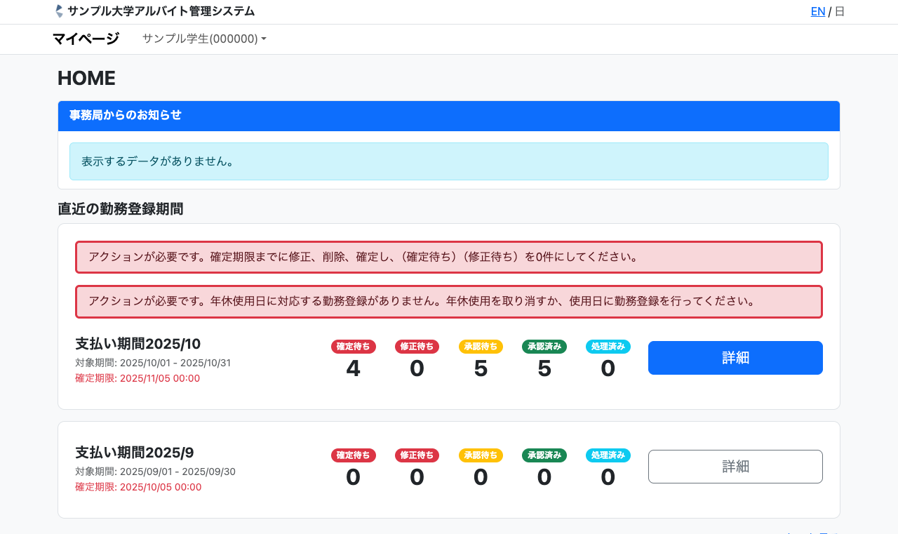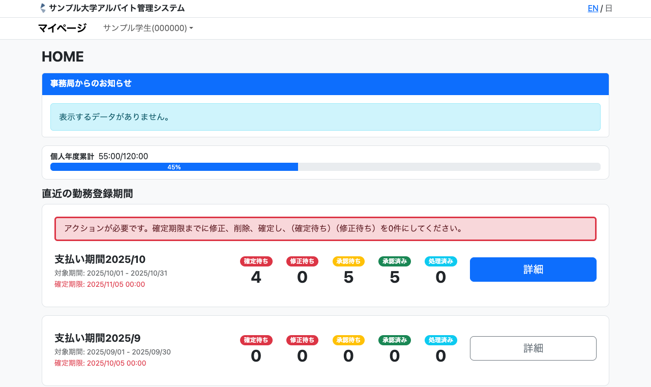利用者がログイン後に最初に表示される画面です。利用者向けのお知らせが掲示されると共に、直近の勤務登録期間が表示されます。アクセス時点で入力が必要な期間については[詳細]ボタンの色が変化するようになっています。自身が勤務登録を行いたい勤務登録期間の[詳細]をクリックすることで、勤務登録の登録や確認が行える画面に遷移します。