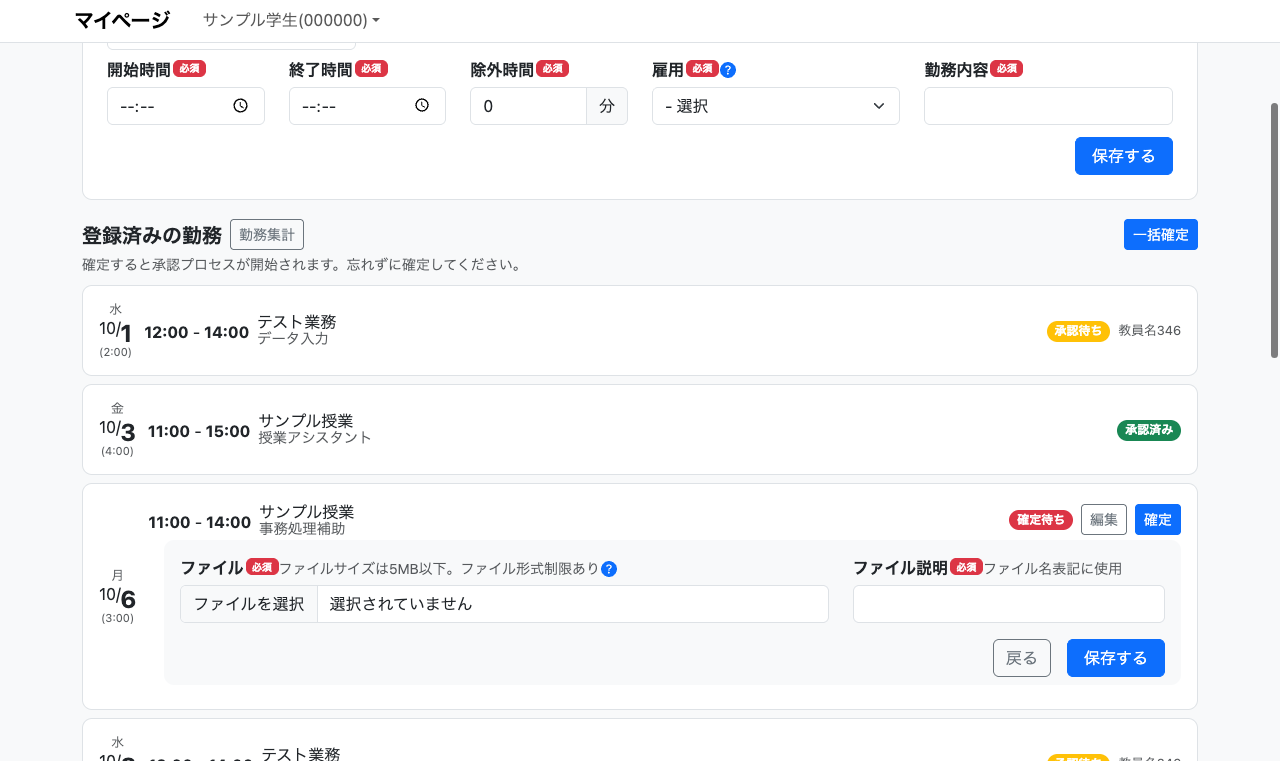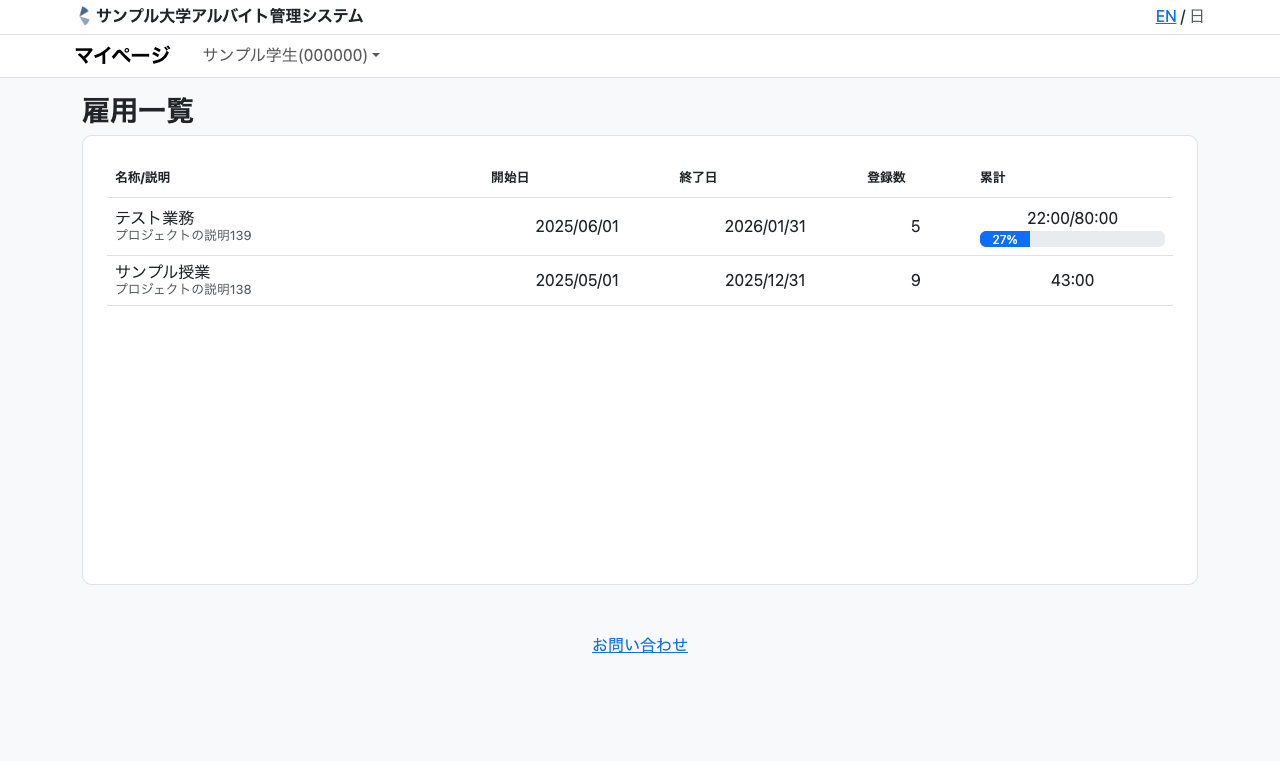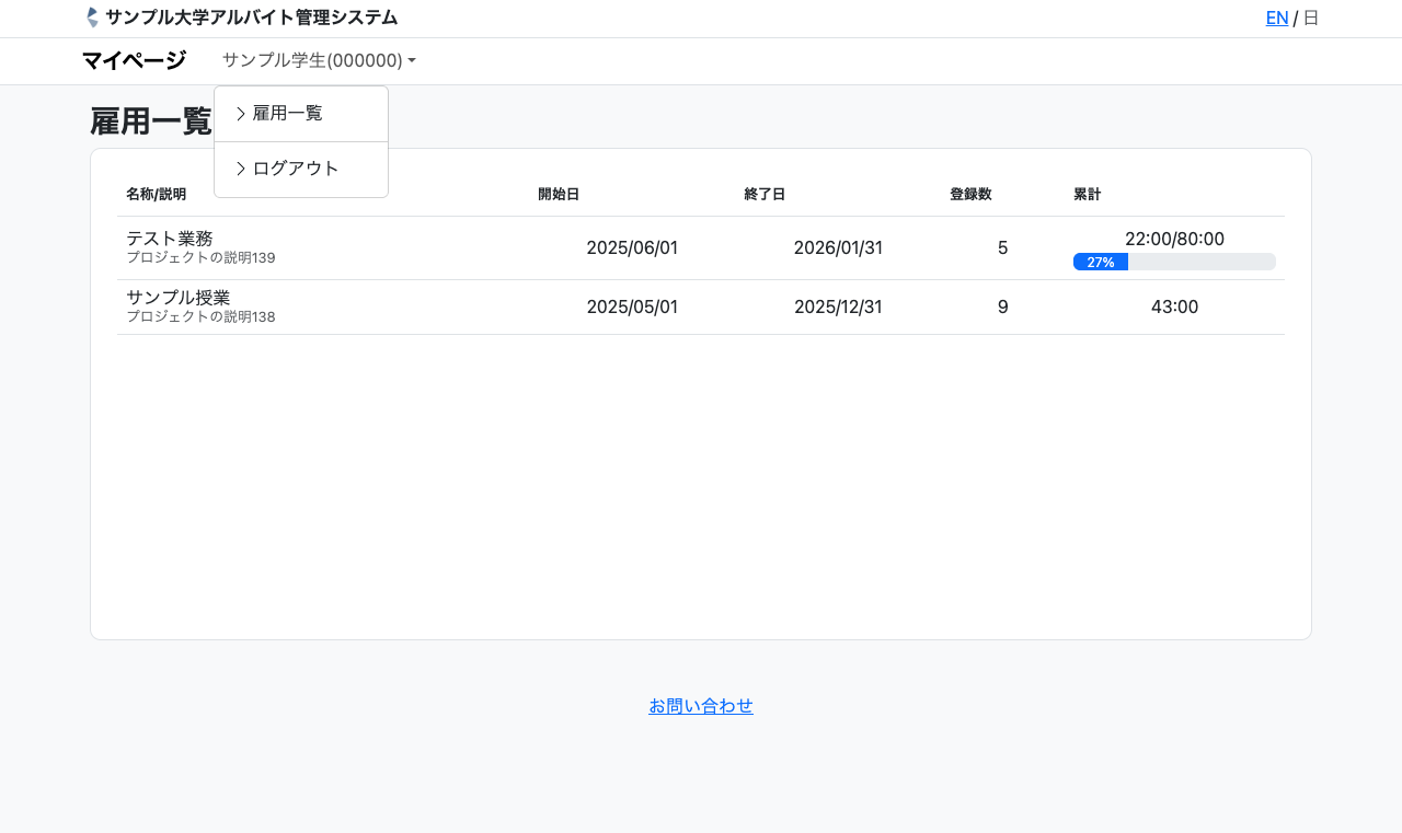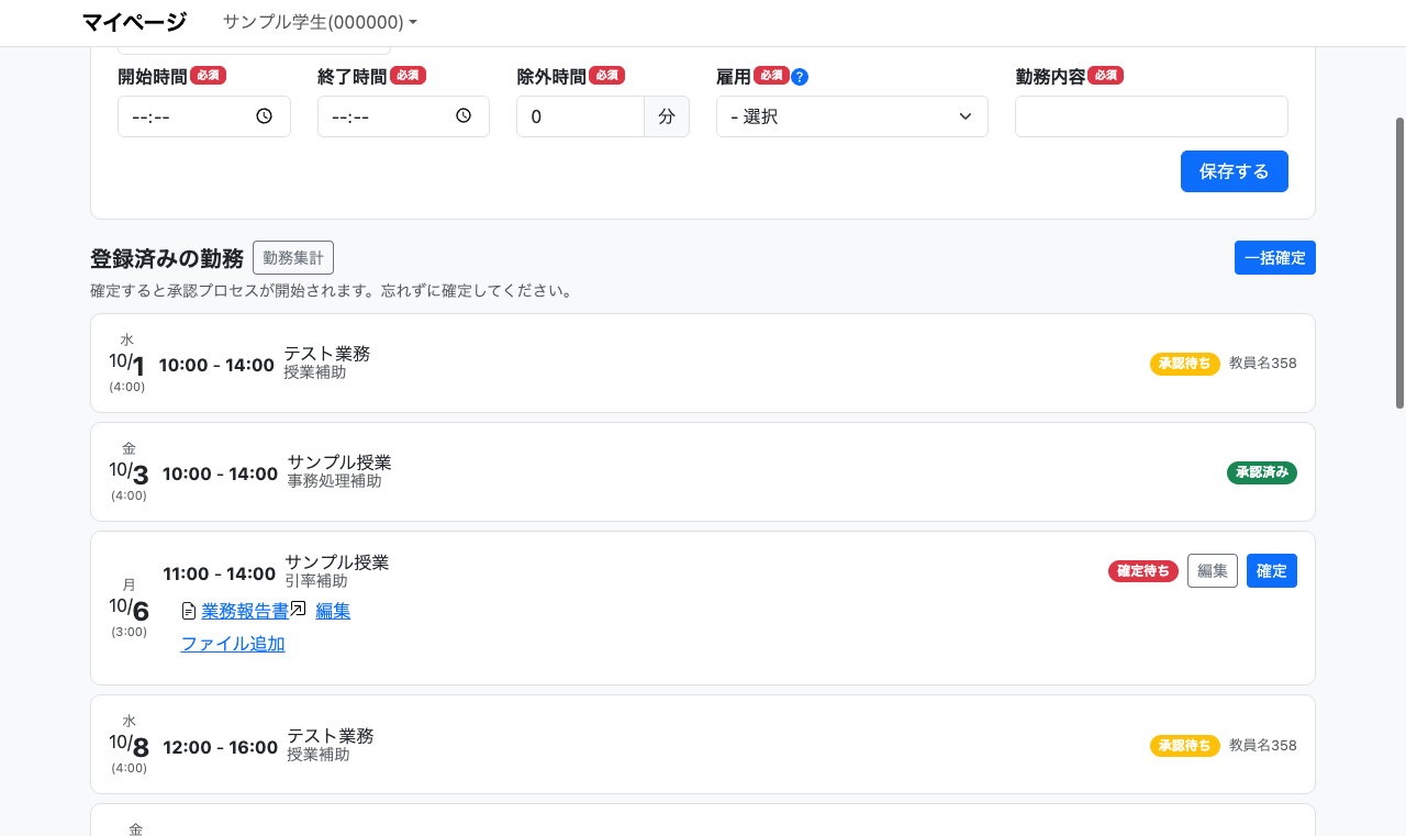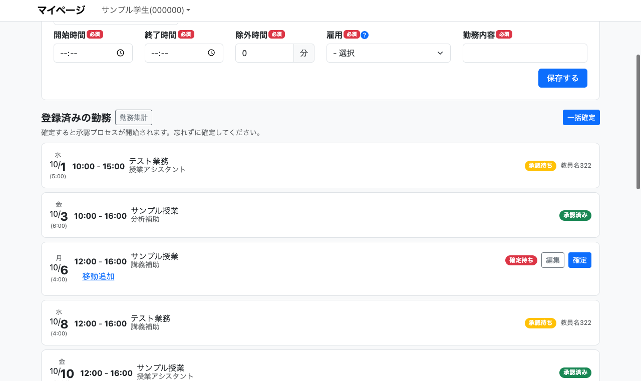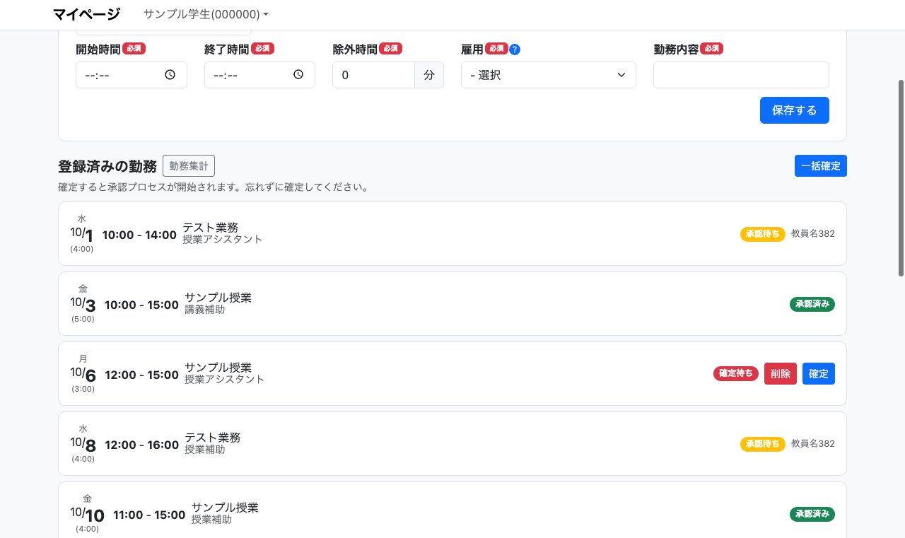 どのようなシステムかの参考情報として、利用者(TAやSAなどの学生アルバイト)向け画面のスクリーンショットを掲載しています。