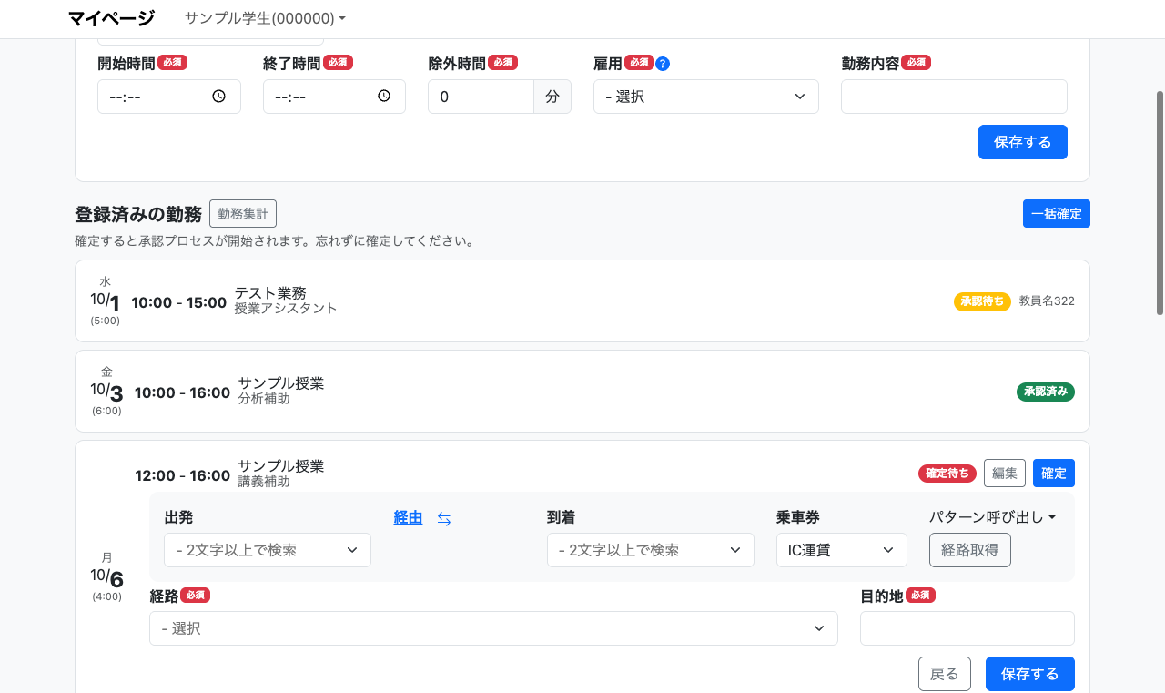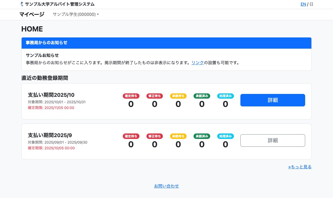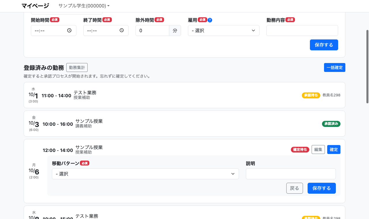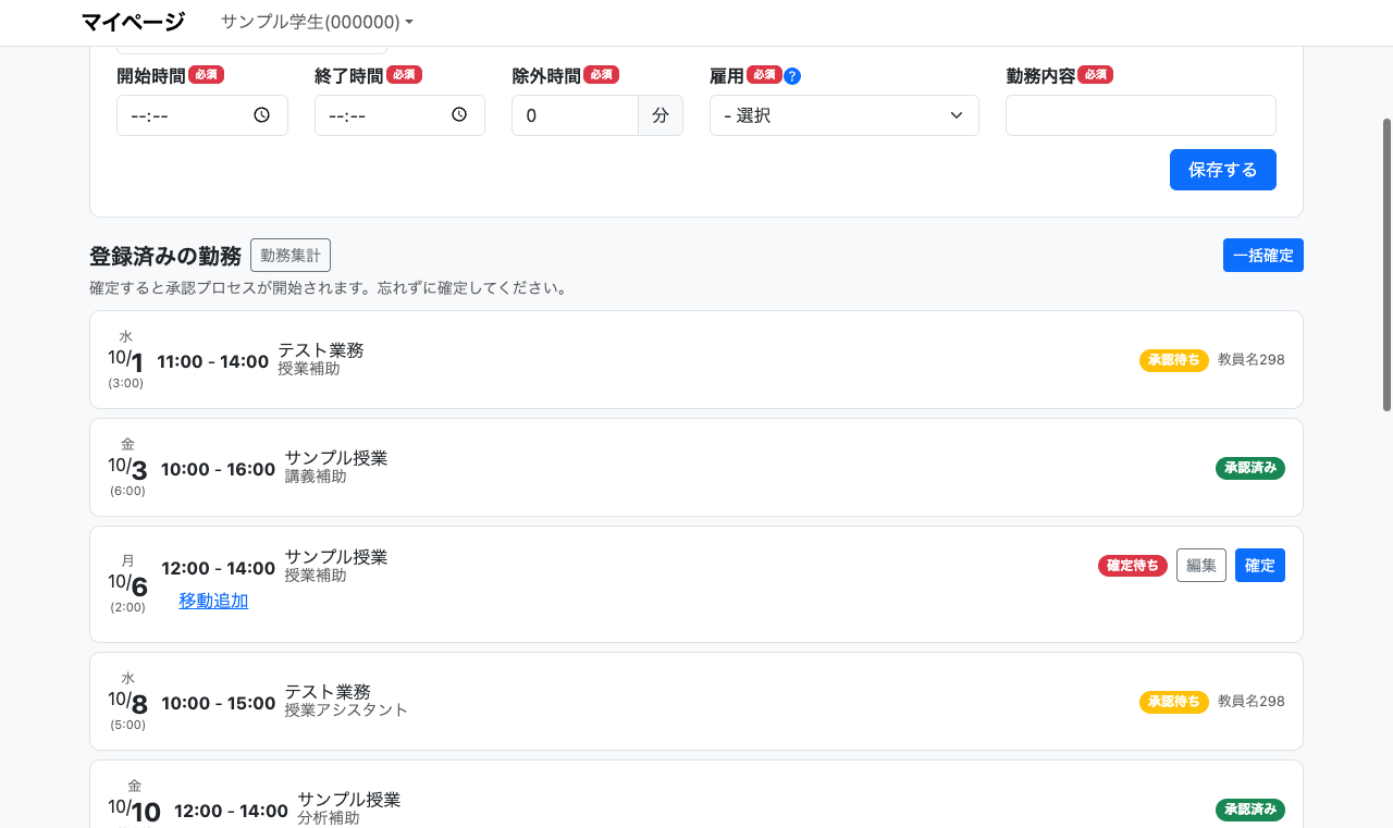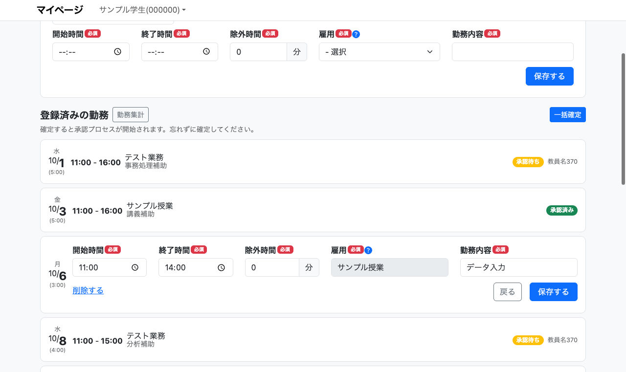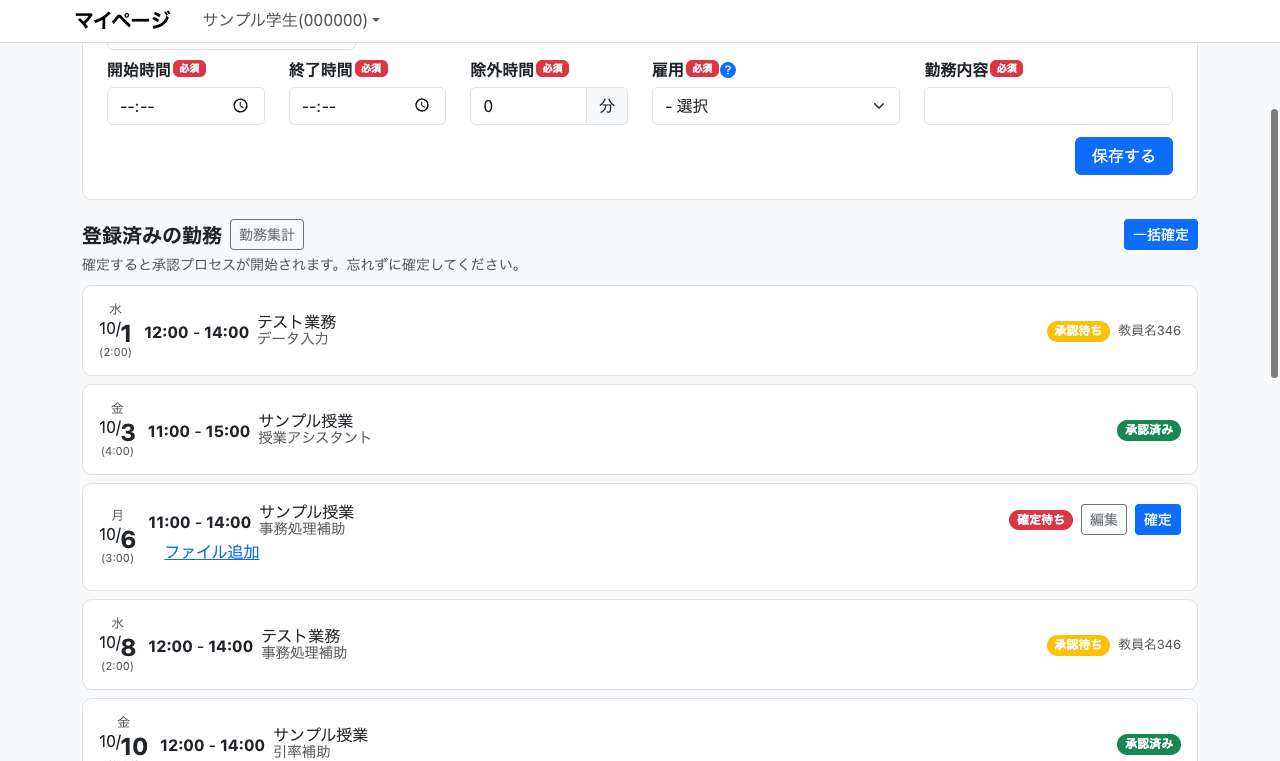 どのようなシステムかの参考情報として、利用者(TAやSAなどの学生アルバイト)向け画面のスクリーンショットを掲載しています。