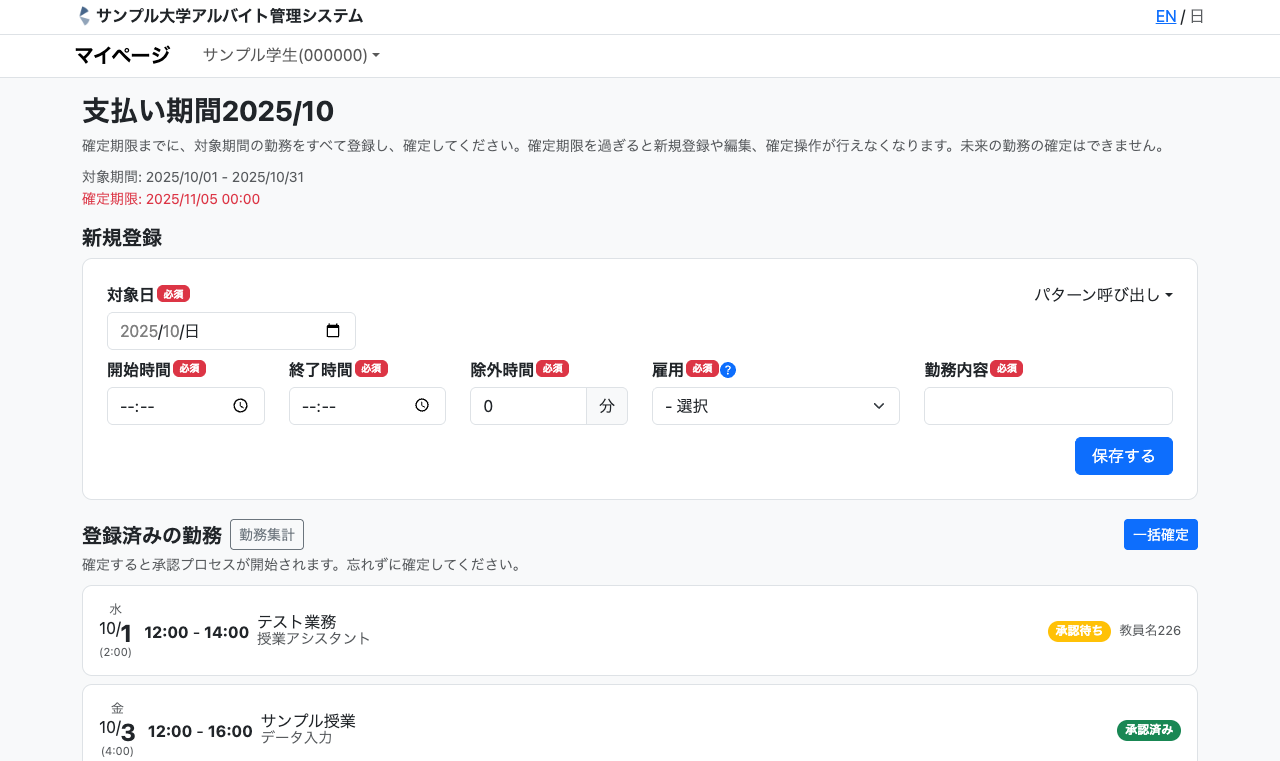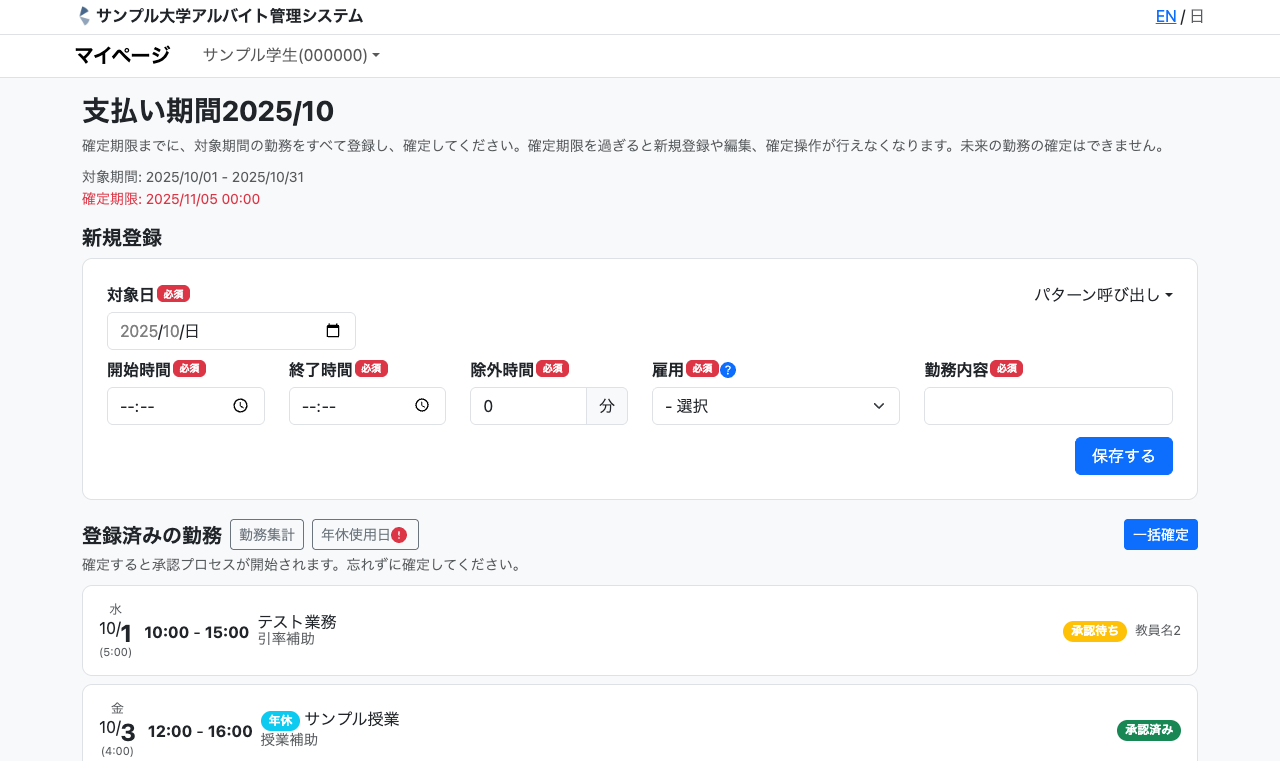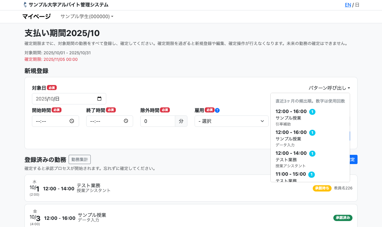 過去の登録履歴から、よく使うパターンを呼び出すことができます。パターン名をクリックすることで、新規登録フォームに対象日以外の内容が入力された状態になりますので、あとは対象日を選択し、[保存する]をクリックしてください。パターン化された業務の登録に便利です。