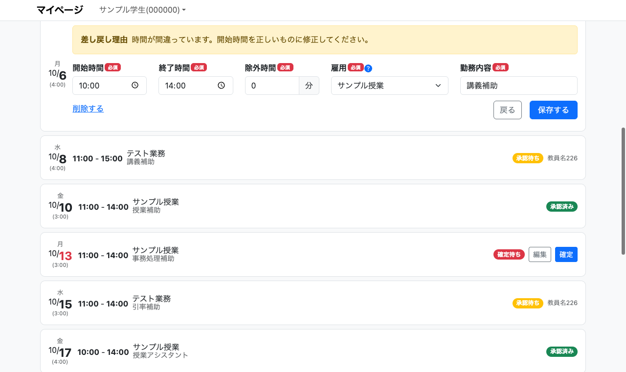 確定操作後、承認プロセスの間に差し戻しされた勤務登録は、承認期限までは再度編集ができる状態になります。[編集]をクリックすると差し戻し理由が表示されますので、修正の上、[保存する]をクリックしてください。その後、忘れずに[確定]をクリックしてください。差し戻し理由によっては登録の取り消し(=削除)が必要な場合があります。その場合は[削除する]をクリックして勤務登録を削除してください。