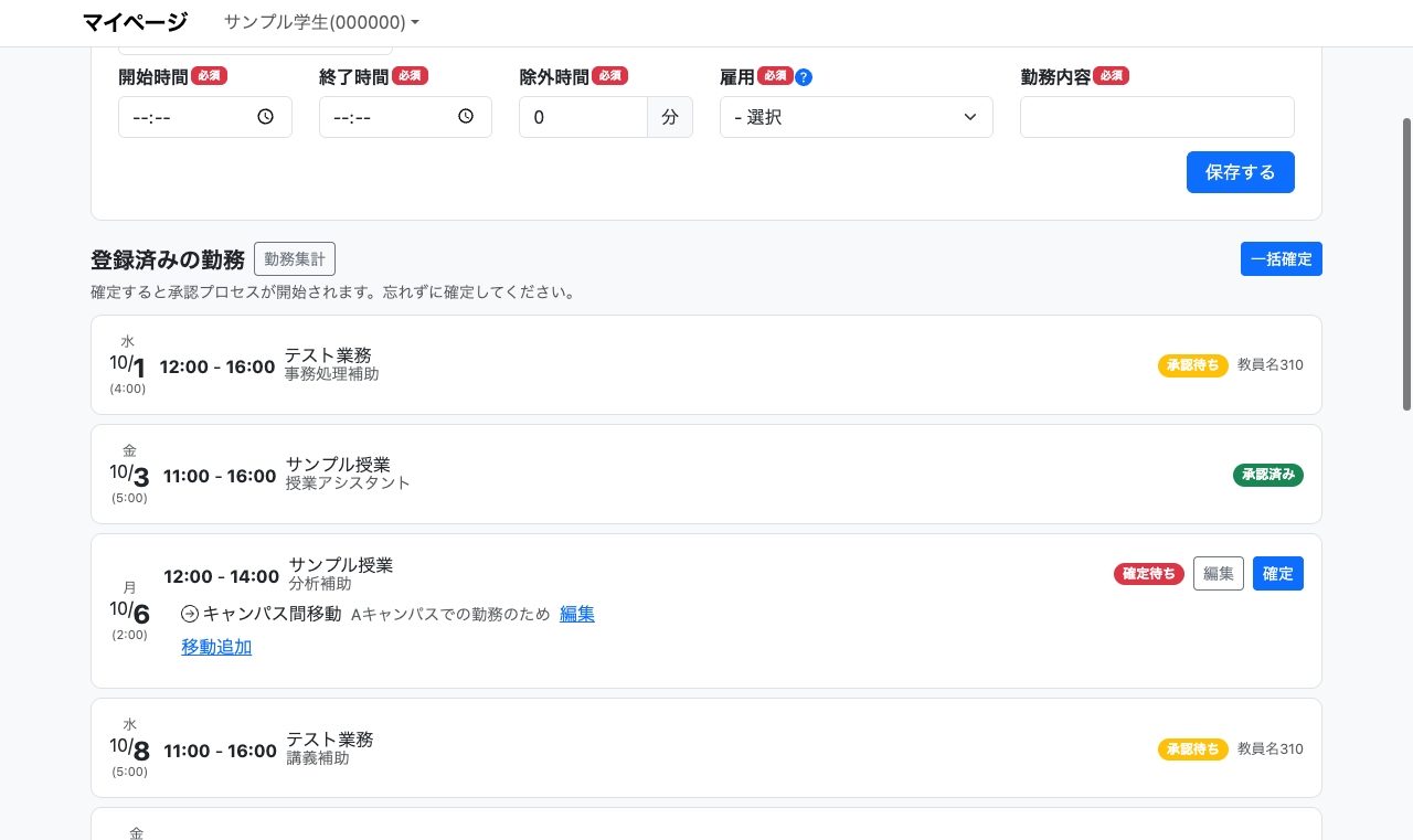 確定操作は登録済みの勤務に表示されている個別の勤務登録横の[確定]をクリックすることでも行えますし、[一括確定]をクリックすることでまとめて確定することも可能です。未来の日付の勤務登録については、確定操作は行えませんのでご注意ください。