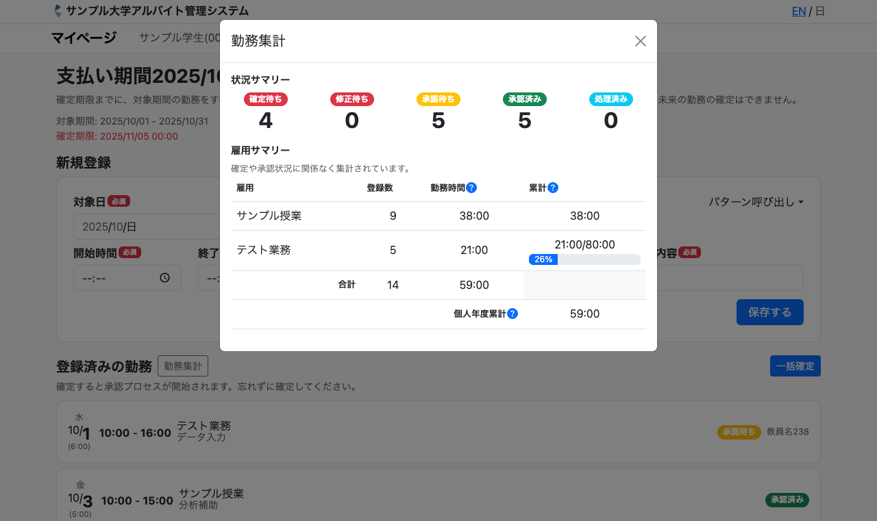 対象となる勤務登録期間での、勤務内容の集計画面です。登録された勤務内容がどういった状況か、また、雇用ごとにどういった集計になっているかを確認することができます。雇用設定で総勤務時間上限が設定されている場合は、累計の消化時間が消化率と共に表示されます。また、移動登録設定が有効な場合には、登録された移動数も表示されるようになります。勤務状況の全体像を把握するのに便利です。