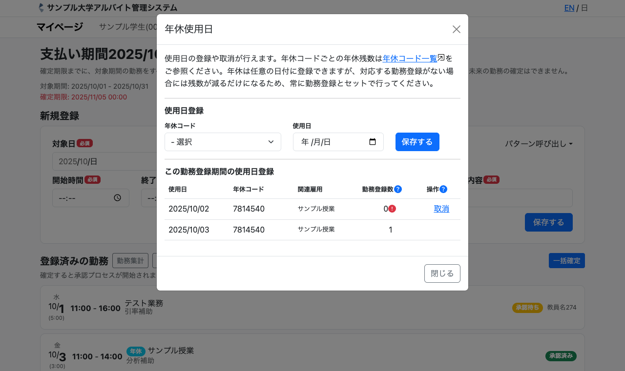 年休使用日は、日を指定して登録します。年休使用日登録が行われているものの、使用日に対応する勤務登録が行われていない場合に修正を促します。