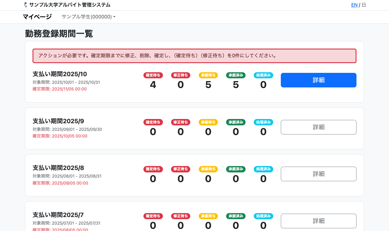 勤務登録の箱となる、勤務登録期間の一覧です。自身の雇用の開始日から終了日を含む期間のみが表示され、それぞれの詳細リンクから画面遷移することで、過去の勤務登録内容を参照することができます。アクセス時点で入力が必要な期間については[詳細]ボタンの色が変化します。