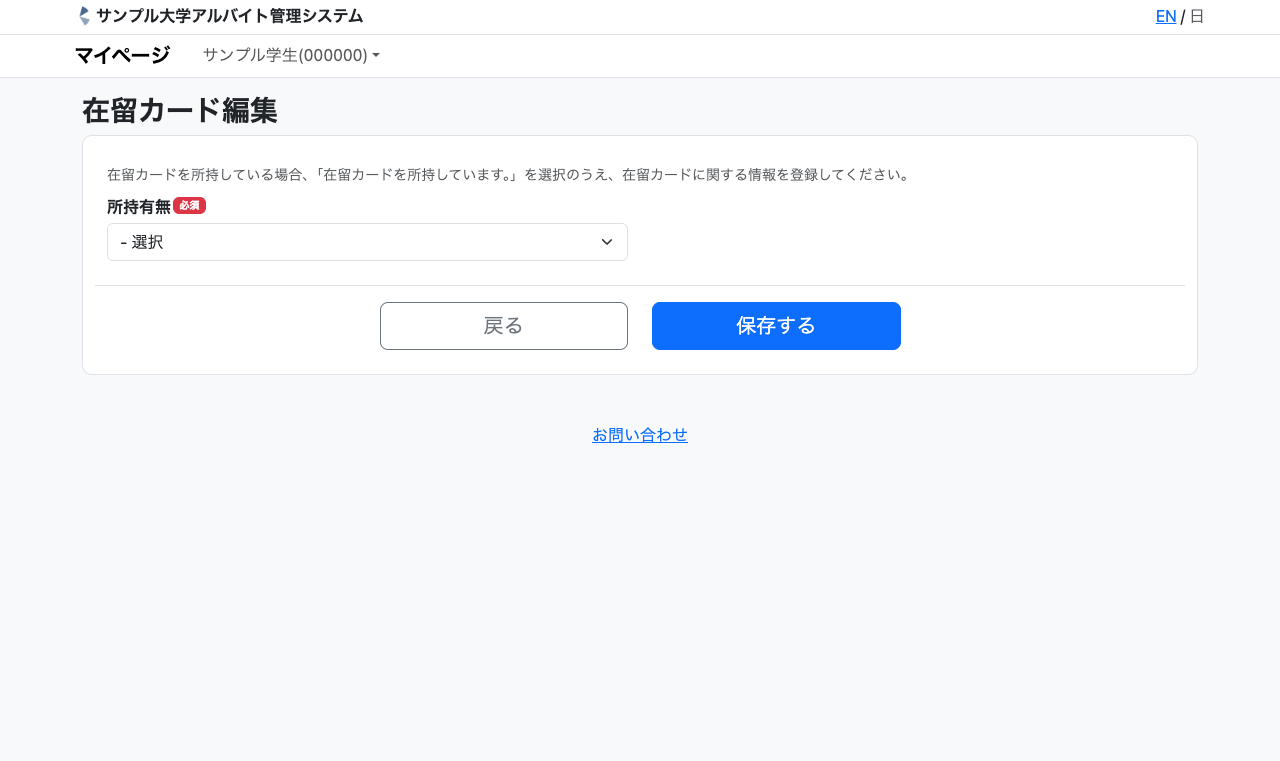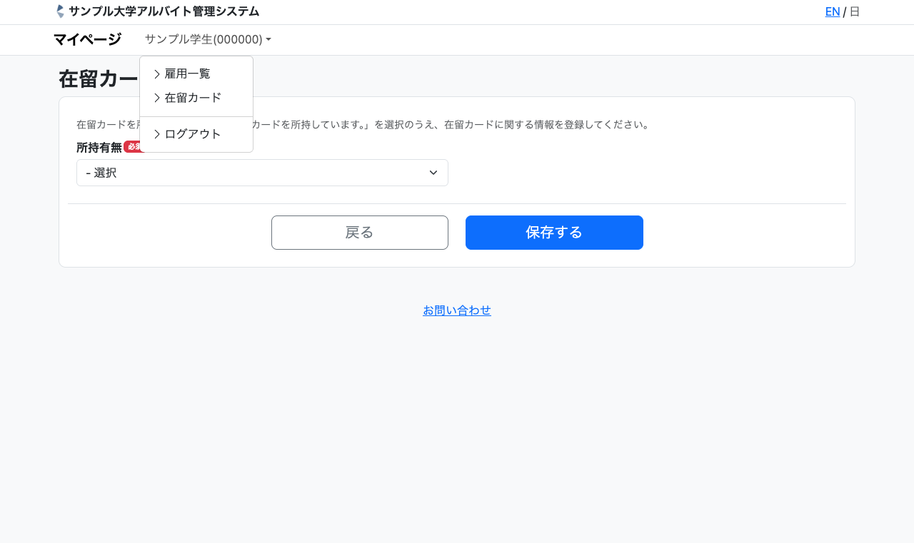 登録後は、上部の自分の名前をクリックして開くメニュー内の[在留カード]から同画面に移動し内容の確認をすることができます。勤怠設定で「登録後変更可」になっている場合、利用者の任意のタイミングでこちらの画面で変更を行うことができますが、「登録後変更不可」になっている場合は初期(または未設定時)登録後は、編集ロックがかかり変更ができなくなります。