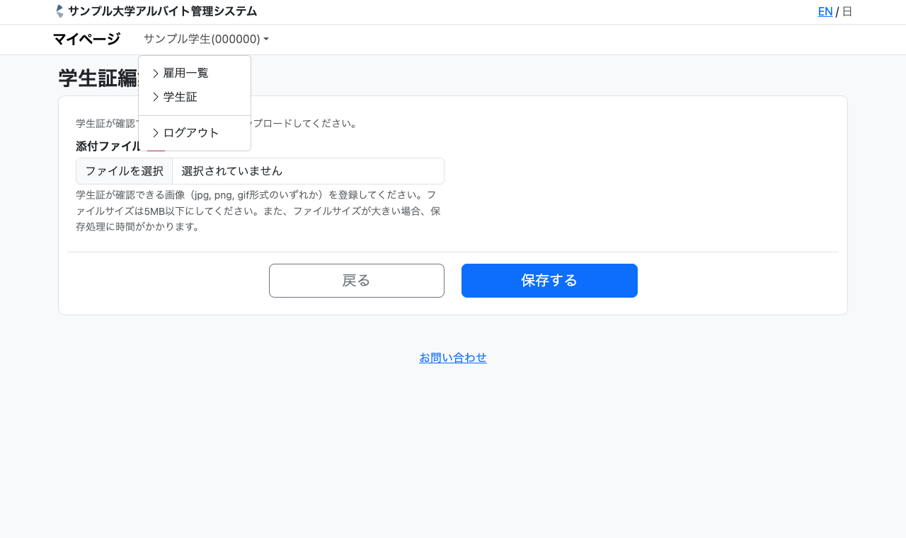 登録後は、上部の自分の名前をクリックして開くメニュー内の[学生証]から同画面に移動し内容の確認をすることができます。勤怠設定で「登録後変更可」になっている場合、利用者の任意のタイミングでこちらの画面で変更を行うことができますが、「登録後変更不可」になっている場合は初期(または未設定時)登録後は、編集ロックがかかり変更ができなくなります。
